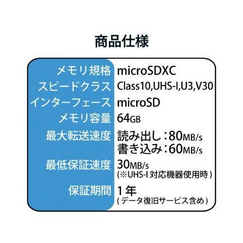 ■メモリ規格:microSDXC■スピードクラス:Class10、UHS-I、U3、V30■インターフェイス:microSD■メモリ容量:64GB■最大転送速度:読み出し:80MB/s、書き込み:60MB/s■最低保証速度:30MB/s(※UHS-I対応機器使用時)■外形寸法:幅15.0mm×高さ11.0mm×奥行1.0mm■重量:約0.4g■付属品:SD変換アダプタ×1■保証期間:1年(データ復旧サービス含む)