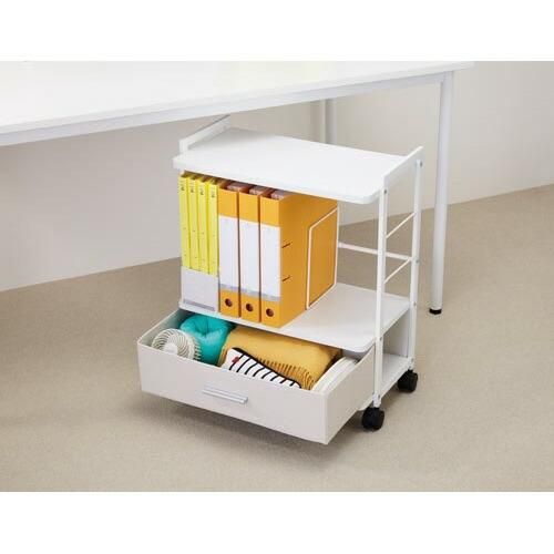 ●材質/天板・棚板:メラミン化粧板、フレーム:スチール(粉体塗装)、引出:ポリエステル・板紙