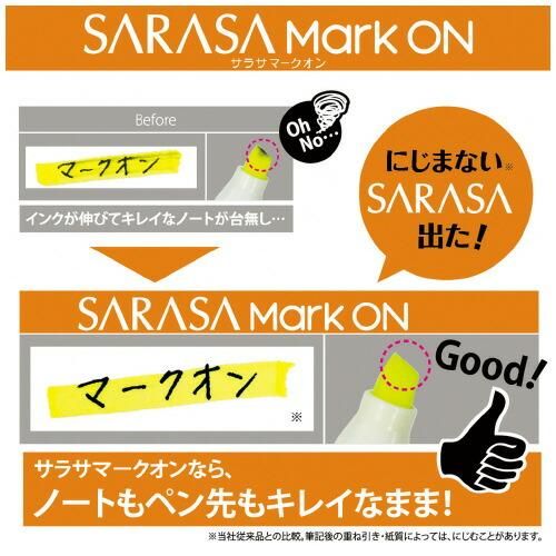 ●書いてすぐ、蛍光ペンを上から引いても汚れない!サラサマークオンを使えば、資料も蛍光ペンのペン先もきれいなまま!資料への書き込み後蛍光ペンでチェックするとき、手帳やノートを蛍光ペンで色分けするとき、宛名書きや注意書きを蛍光ペンで目立たせたいとき、TO DOリストにもおすすめ!サラサマークオン0.4mm対応中芯。