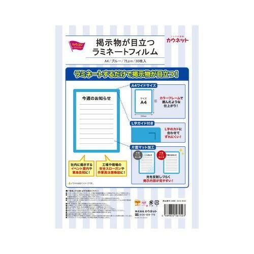 カウネット 掲示物が目立つラミネートフィルム A4サイズ ブルー 30枚 4310-8534