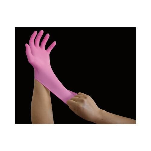 ●華やかなピンクで、均一な厚みで破れにくい、厚さ約0.075mmのレギュラータイプの使い捨てニトリルゴム手袋(粉なし)